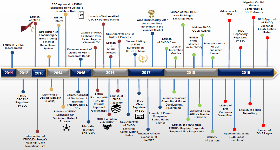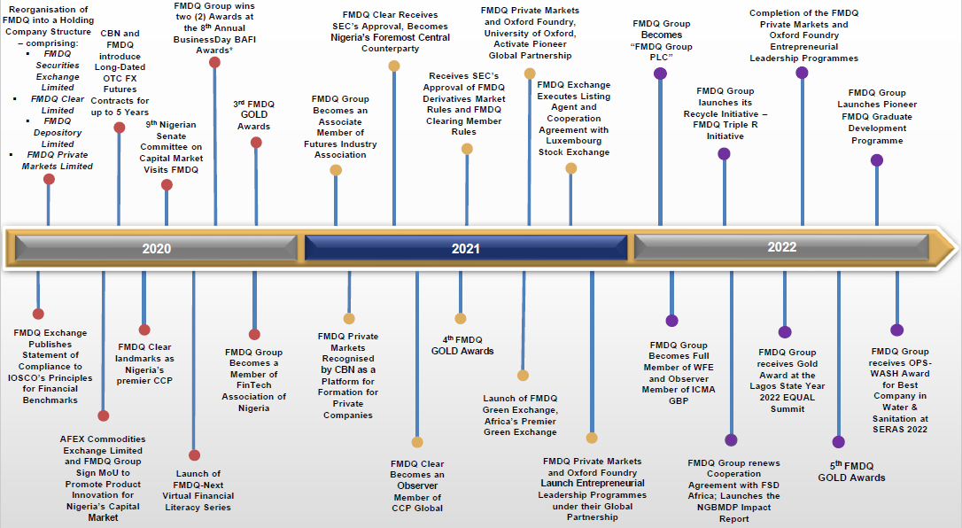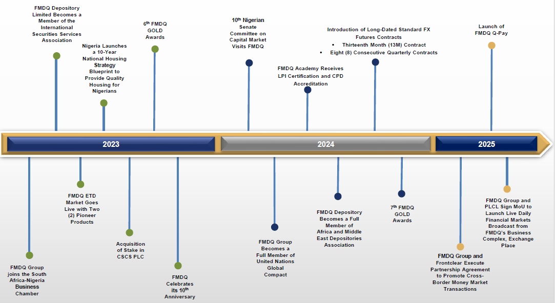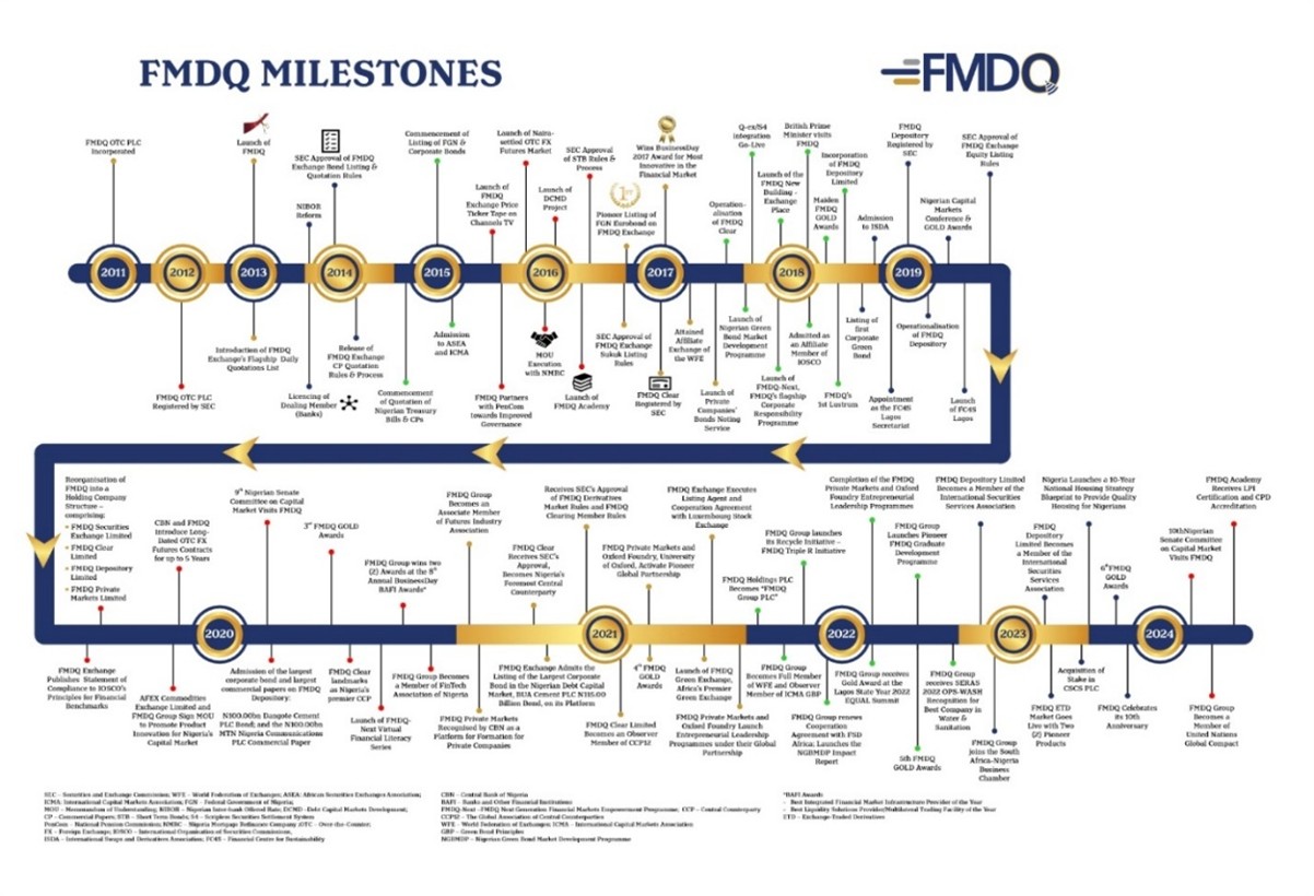 FMDQ Group PLC (“FMDQ Group”), has evolved over the years from an OTC Market to a full-fledged Securities Exchange, to a budding financial market infrastructure (FMI) Group, now structured as a Securities and Exchange Commission (SEC)-registered Capital Market Holding Company, warehousing five (5) wholly owned subsidiaries, including FMDQ Securities Exchange Limited (Nigeria’s Largest Exchange by Market Turnover – with an annual average of c. ₦203.80 trillion over the last ten (11) years), FMDQ Clear Limited (Nigeria’s Foremost Central Counterparty – with c. $67 billion derivatives contracts cleared), FMDQ Depository Limited (Nigeria’s Integrated Securities Depository), FMDQ Private Markets Limited (Nigeria’s Private Capital Information Repository) and iQx Consult Limited (an Information Technology Services Company).